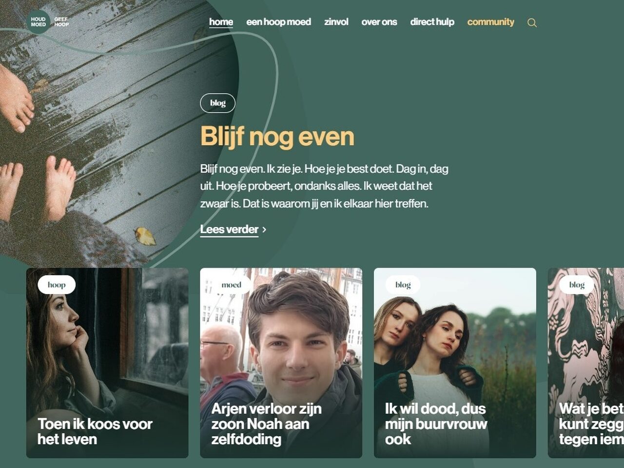 Houd Moed is het online platform voor iedereen die te maken heeft (gehad) met zelfdoding. Hier worden regelmatig artikelen, verhalen van hoop en herkenning gepubliceerd.